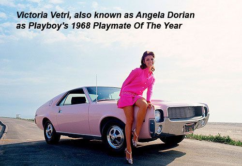 In 1968 Playboy and American Motors Corp. joined together to create a unique moment in each of their histories. A pink 1968 AMX was awarded to Angela Dorian (Victoria Vetri) by Playboy for being named as their 1968 Playmate Of The Year.