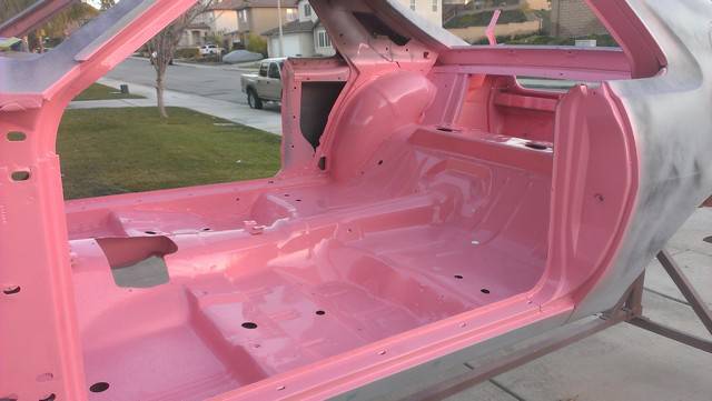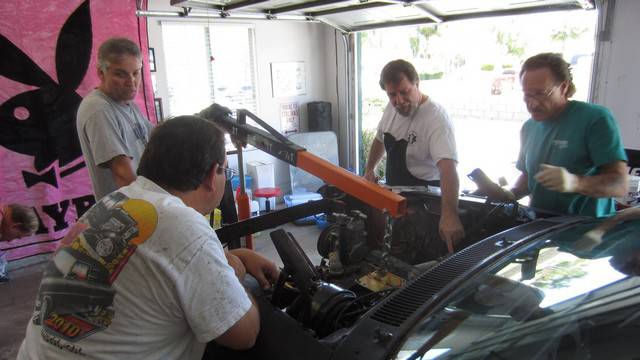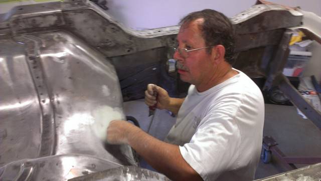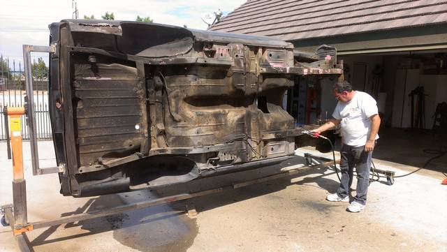 After the Playmate AMX's sale in July, 2010 it was placed in storage for 2 years while a plan was developed how to best restore the car. In June of 2012 it was moved to a fellow club member's home where it was disassembled with the help of 8 other club members. Over the next 6 months a rotisserie was built for the car, and extensive work on the body began. The lower right quarter inner and outer panels were replaced. Holes were filled in the floor pan, and other various sheet metal panels were straightened. The job of cleaning the undercoating began. It was a slow process.